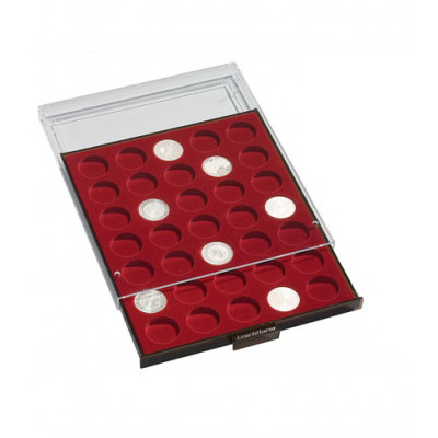 Facheinteilungen für alle gängigen Münzen. Münzboxen können nach Belieben erweitert werden, sind stapelbar und mit samtartigen Einlagen ausgestattet. Münzen passen genau in die Vertiefung, dadurch haben diese einen festen Halt und eine hervorragende Optik. Durch Fingerdruck kann die Münze leicht herausgedrückt werden.