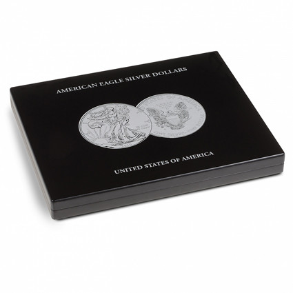 Edle, schwarze Münzkassette zur Unterbringung von 20 American Eagle-Silbermünzen (Ausführung: 1 Unze) in Kapseln (InnenØ 41 mm). 1 Einlage mit schwarzer, veloursartiger Oberfläche und 20 runden Feldern (Ø 47,5 mm). Silberfarbener Deckel- und Kissendruck mit Münzmotiv. Deckelkissen mit schwarzem Satin gepolstert. Sicherer und unauffälliger Magnetverschluss. Außenformat: 305 x 30 x 245 mm.