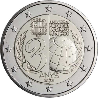 Das Motiv der Münze zeigt eine stilisierte „30“ aus einer Weltkugel und der Ziffer 3 – ein Symbol für Andorras 30-jähriges Engagement in der internationalen Gemeinschaft. Ergänzt wird das Design durch das andorranische Wappen und die Inschrift „ANDORRA MEMBRE DE LES NACIONS UNIDES 2023“.