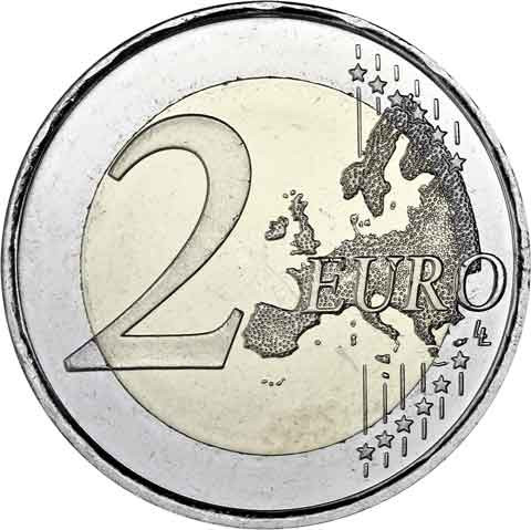 Die Rückseite entspricht der Standardgestaltung der 2-Euro-Umlaufmünzen mit Europakarte und dem Nennwert „2 EURO“.