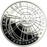 Das Motiv dieser 10-DM-Münze zeigt im Zentrum das Emblem der Organisation „SOS-Kinderdörfer“, symbolisch umsponnen von einem Netzwerk.