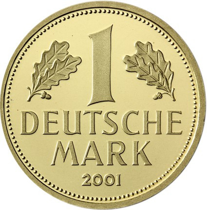 Die 1 DM-Gold 2001 Münzzeichen "J" - der Bundesrepublik Deutschland. Von den 1.000.000 geprägten Exemplaren wurden je 200.000 Münzen in Stempelglanz von den Deutschen Prägestätten in Berlin, München, Stuttgart, Karlsruhe und Hamburg geprägt. Sie war dem Abschied von der Deitschen Mark gewidmet. Da die Deutsche Bundesbank ursprünglich nicht berechtigt war, eine solche Münze zu prägen, wurde eigens für die Goldmark ein Gesetz verabschiedet. Dieses erlaubte dann der Bank das prägen dieser Münze.