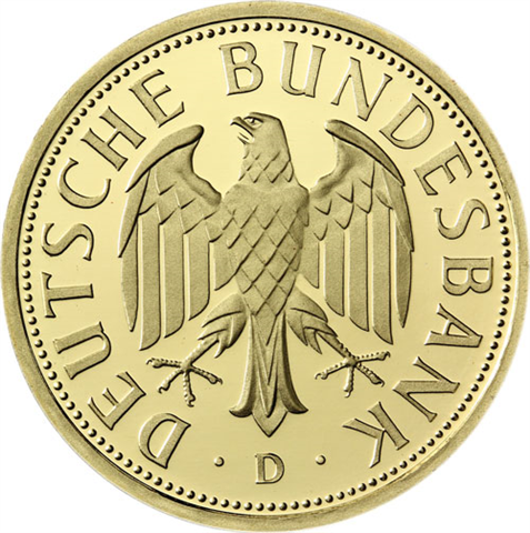 Die 1 DM-Gold 2001 Münzzeichen "D" - der Bundesrepublik Deutschland. Von den 1.000.000 geprägten Exemplaren wurden je 200.000 Münzen in Stempelglanz von den Deutschen Prägestätten in Berlin, München, Stuttgart, Karlsruhe und Hamburg geprägt. Sie war dem Abschied von der Deitschen Mark gewidmet. Da die Deutsche Bundesbank ursprünglich nicht berechtigt war, eine solche Münze zu prägen, wurde eigens für die Goldmark ein Gesetz verabschiedet. Dieses erlaubte dann der Bank das prägen dieser Münze.