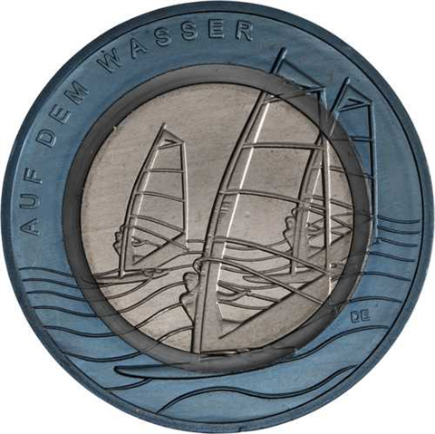 Die Bildseite gibt die wesentlichen Aspekte des modernen Windsurfens auf sehr eindrucksvolle Art wieder. Die Segel der in der Gruppe surfenden Sportler sind mit dem Wellengang verwoben. Die Komposition in ihrer Gewichtung von rechts nach links im Münzgrund betont die Geschwindigkeit auf dem Wasser. Die grafisch gehaltene Darstellung schafft große Transparenz und Tiefe. Das Bildmotiv wird hervorragend in die drei verschiedenen Segmente der Münze mit Polymerring eingepasst.
