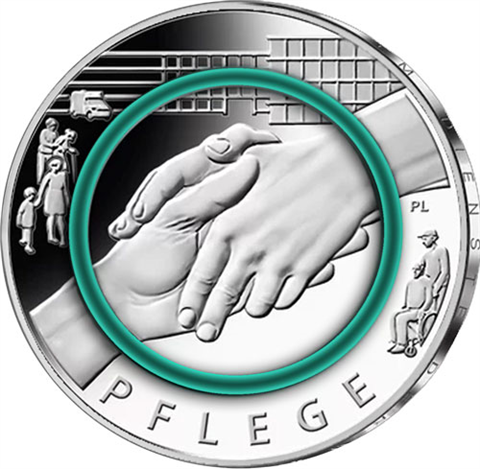 Die 10-Euro-Serie „Im Dienst der Gesellschaft“ beginnt im Jahr 2022 mit der Ausgabe „Pflege“. Um die Berufsgruppen Wertzuschätzen, die unter Einsatz des eigenen Lebens, für die Gesellschaft und unser Zusammenleben besonders wichtig sind. Der Polymerring unterscheidet sich je nach Ausgabe voneinander und lässt sich den jeweiligen Berufsgruppen zuordnen.