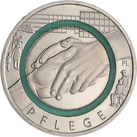 Die 10-Euro-Serie „Im Dienst der Gesellschaft“ beginnt im Jahr 2022 mit der Ausgabe „Pflege“. Um die Berufsgruppen Wertzuschätzen, die unter Einsatz des eigenen Lebens, für die Gesellschaft und unser Zusammenleben besonders wichtig sind. Der Polymerring unterscheidet sich je nach Ausgabe voneinander und lässt sich den jeweiligen Berufsgruppen zuordnen.