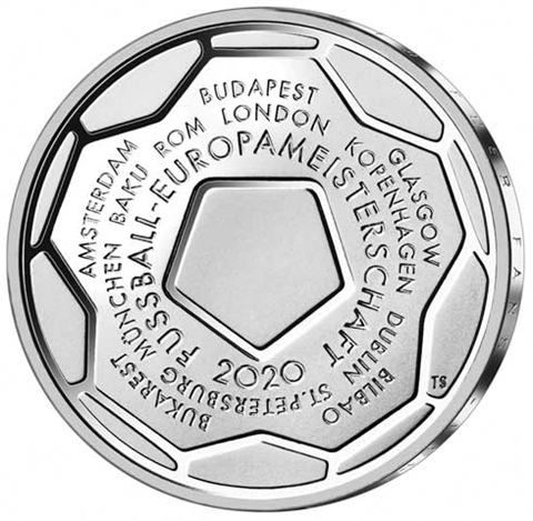 Die Nennung der 12 Austragungsorte auf der Silbermünze unterstreicht die Besonderheit dieser länderübergreifenden Fußball-Europameisterschaft 2020. Die Wertseite der Silbermünze zeigt einen Adler, den Schriftzug „BUNDESREPUBLIK DEUTSCHLAND“, Wertziffer und Wertbezeichnung, das Prägezeichen „J“ der Hamburgischen Münze, die Jahreszahl 2020 sowie die zwölf Europasterne. Zusätzlich ist die Angabe „SILBER 925“ aufgeprägt.