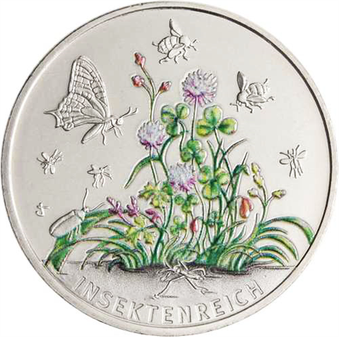 Jordi Truxa hat mein seinem Motiv einen allgemeinen Einblick in die Welt der Insekten geschaffen. Die Bildseite zeigt mit Land, Wasser und Luft den vielseitigen Lebensraum der Insekten. Durch den gekonnten Einsatz von Farbe werden Teile des Reliefs gekonnt in den Vordergrund gerückt. Durch die zarte Kolorierung dieser filigranen Darstellung von Pflanzen und Insekten entsteht ein harmonisches Gesamtbild auf der Bildseite dieser ersten Münze. Am unteren Bildrand befindet sich der Schriftzug „Insektenreich“.