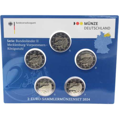 Mit dem offiziellen Stempelglanz-Komplettsatz 2024 im Folder erhalten Sammler alle fünf deutschen Prägestätten in einer hochwertigen und geschützten Ausgabe. Das Motiv „Kreidefelsen Rügen“ würdigt das Bundesland Mecklenburg-Vorpommern und erscheint als zweite Ausgabe der neuen Serie „Bundesländer II“.