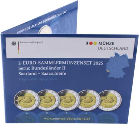 Deutschland 5 x 2 Euro Münzen Saarland „Saarschleife“ Mzz. A-D-F-G-J 2025 "Polierte Platte"