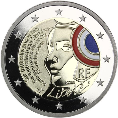 Die Vorderseite der Münze zeigt Marianne, das Sinnbild der Französischen Republik, in modernem, grafischem Profil mit phrygischer Mütze. Rechts über den Buchstaben „RF“ befindet sich die trikolorefarbene Kokarde in Umrissen. Links ist ein Auszug aus dem Gedicht „Liberté“ von Paul Éluard zu lesen, der Bezug auf das republikanische Motto „Liberté, Égalité, Fraternité“ nimmt. Das Prägejahr 2015 ist mittig angeordnet, die Münzzeichen liegen links.