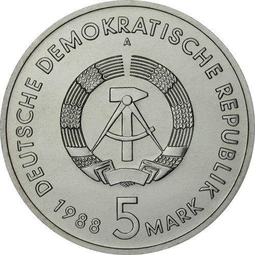 Die DDR 5 Mark Münze von 1988 zeigt den Überseehafen Rostock als Motiv und erinnert an die bedeutende Rolle dieses Hafens in der Geschichte der Stadt und der DDR.