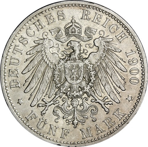 Die 5-Mark-Silbermünze Jäger 176 aus dem Deutschen Kaiserreich (1892–1913) zeigt das Porträt von König Wilhelm II. von Württemberg. Geprägt wurde sie in der Münzprägestätte Stuttgart mit dem Münzzeichen „F“. Gewicht: 27,77 g, Durchmesser: 38 mm.