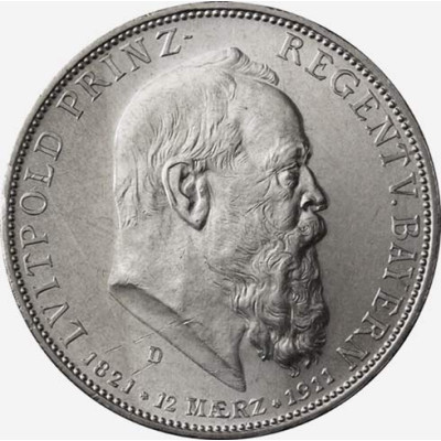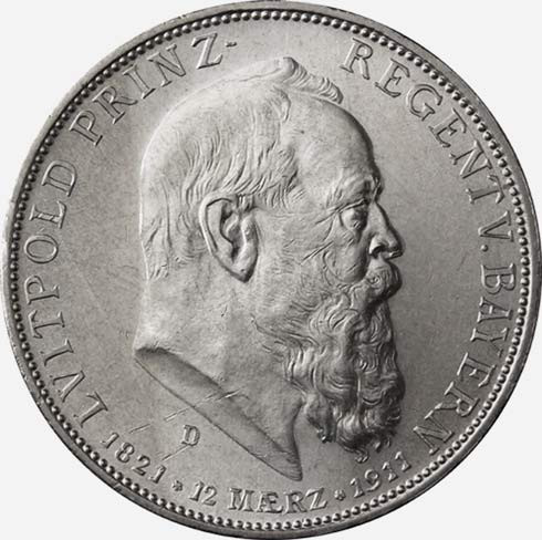 Vorderseite: Das Porträt von Prinzregent Luitpold zeigt ihn im hohen Alter nach rechts blickend, umgeben von der Inschrift „LVITPOLD PRINZ-REGENT V. BAYERN“ sowie den Gedenkdaten „1821 * 12 MÆRZ * 1911“. Unter dem Halsabschnitt befindet sich der Buchstabe „D“ für die Münchner Prägestätte.
