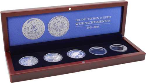 Dieses Etui ist speziell entworfen worden, um die 5 deutschen 25-Euro-Münzen zum Thema "Weihnachten" der Jahre 2021 bis 2025 sicher aufzubewahren und stilvoll zu präsentieren.